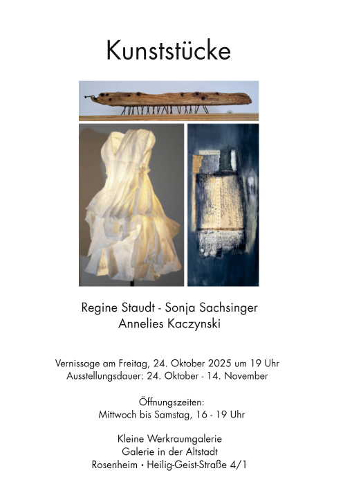 Die Ausstellungseröffnung findet statt am Freitag, den 24. Oktober um 19 Uhr, in der Kleinen Werkraumgalerie/Atelier in der Altstadt, Heilig-Geist-Str. 4/1, Rosenheim statt.